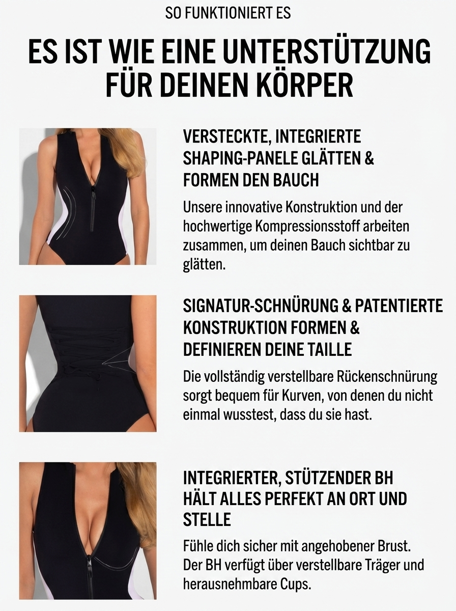 Unsere Badeanzüge sind formende Einteiler, die den Körper glätten, modellieren und optimal stützen – dank integrierter Shaping-Einsätze, verstellbarer Schnürung und einem besonders stützenden BH. Sie bieten außerdem ein elegantes Rückendesign, herausnehmbare Push-up-Cups und UPF 50+ Sonnenschutz.
